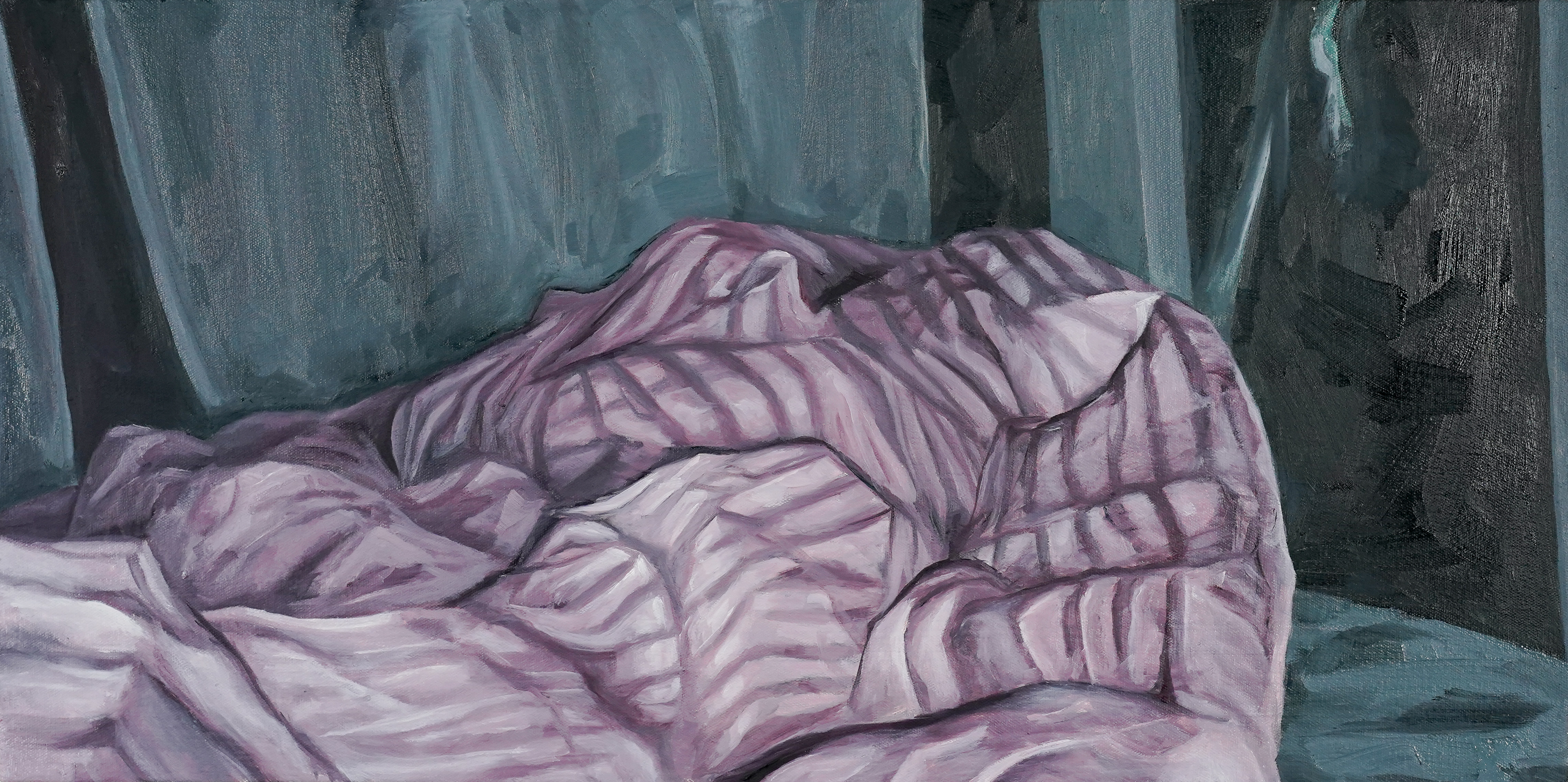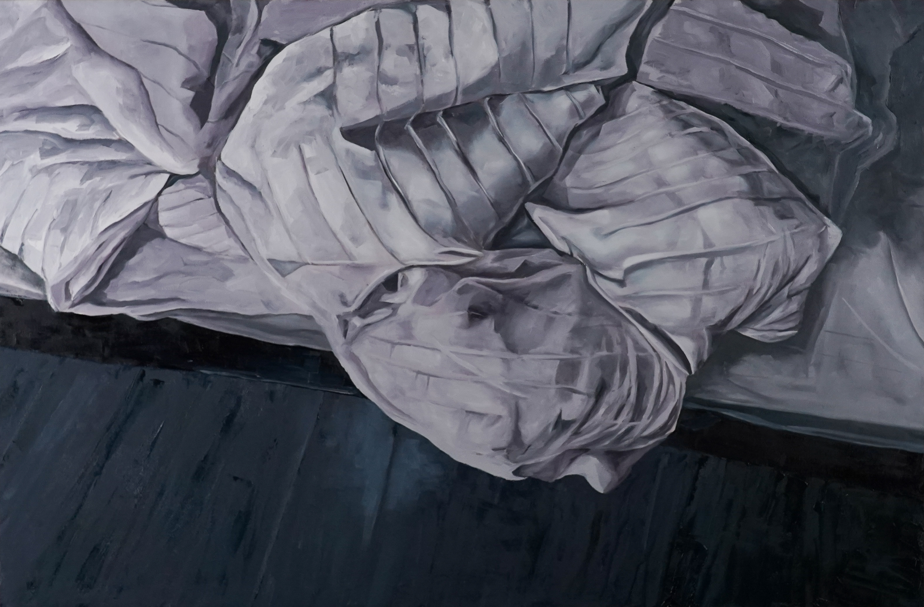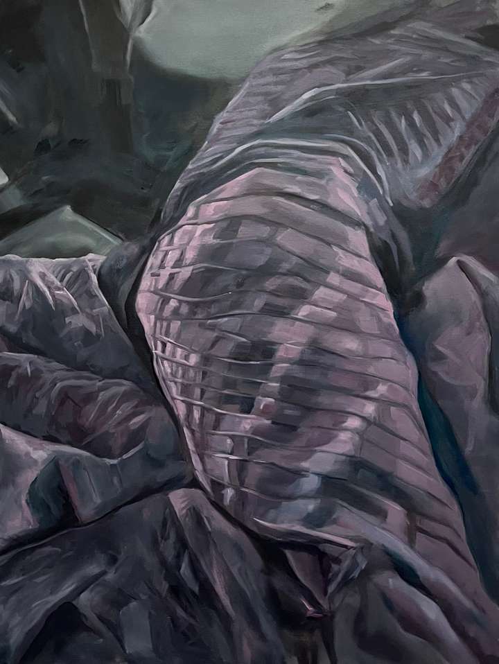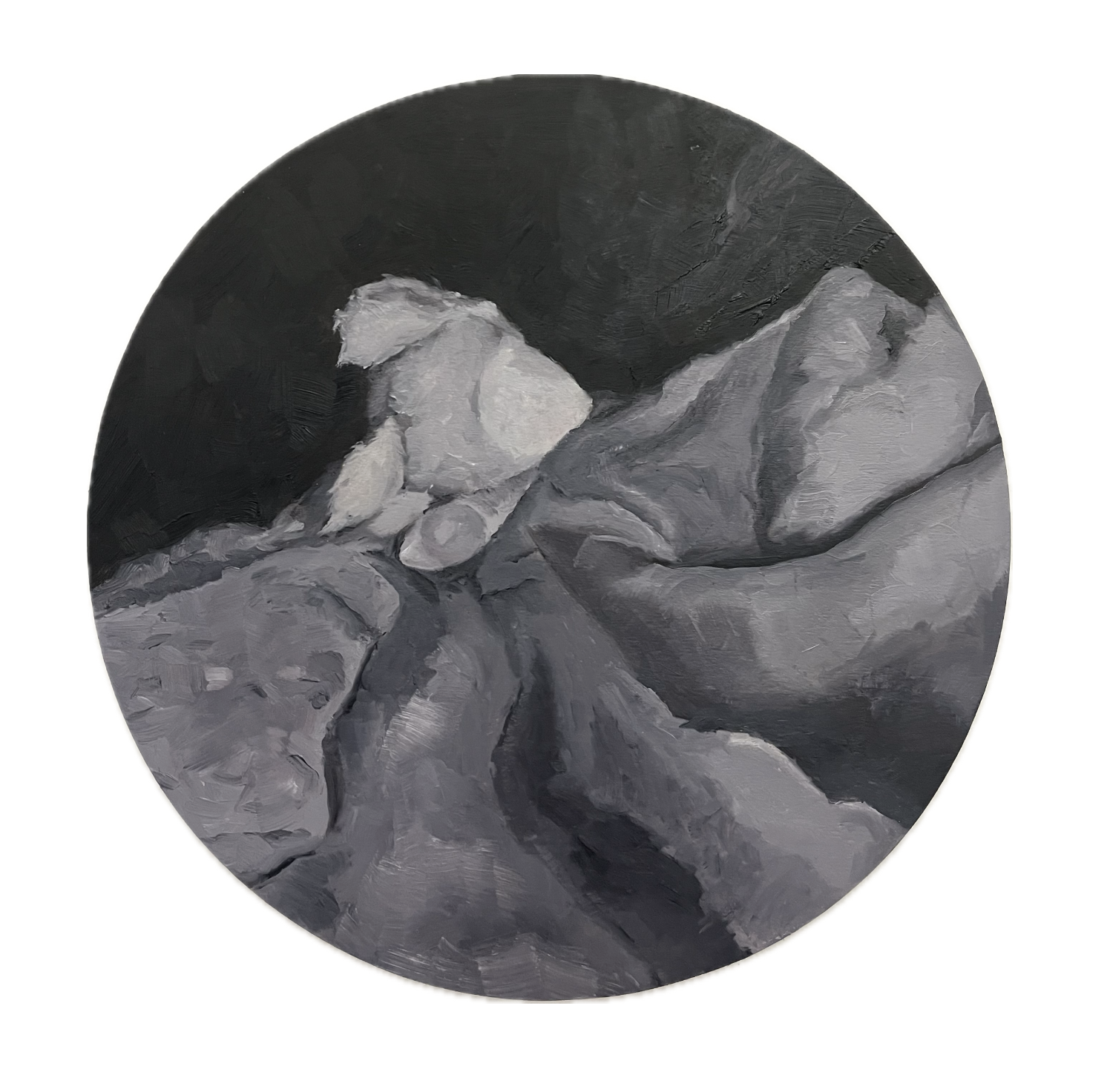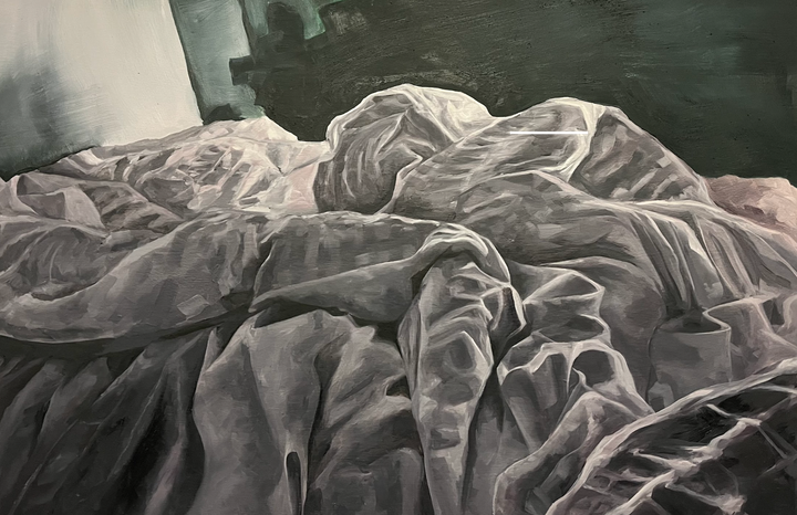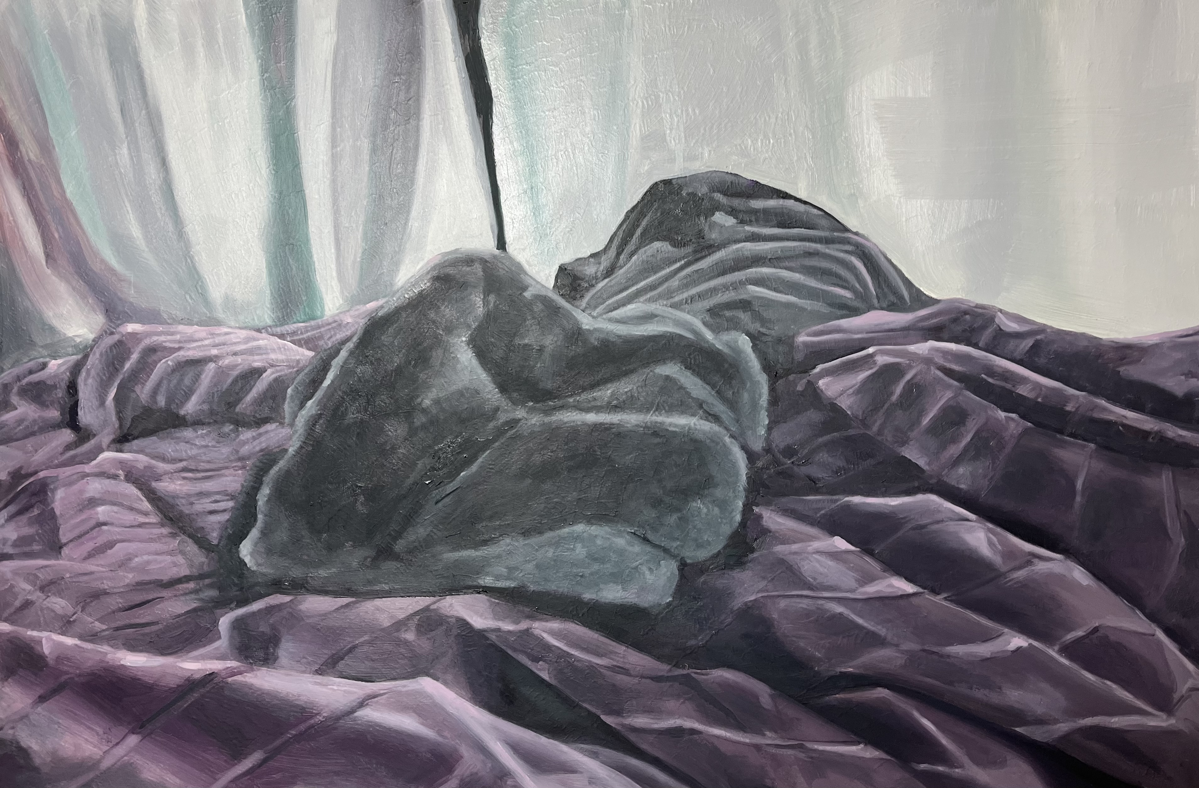 Lately, my practice has focused on platonic intimacy. Bedscapes, a series of emotional fabric landscapes, illustrates this through naturalistic oil paintings that merge classical landscape traditions with my tangible obsession with bodily fabric. This body of work reflects a universal longing for shared calm at the end of the day.