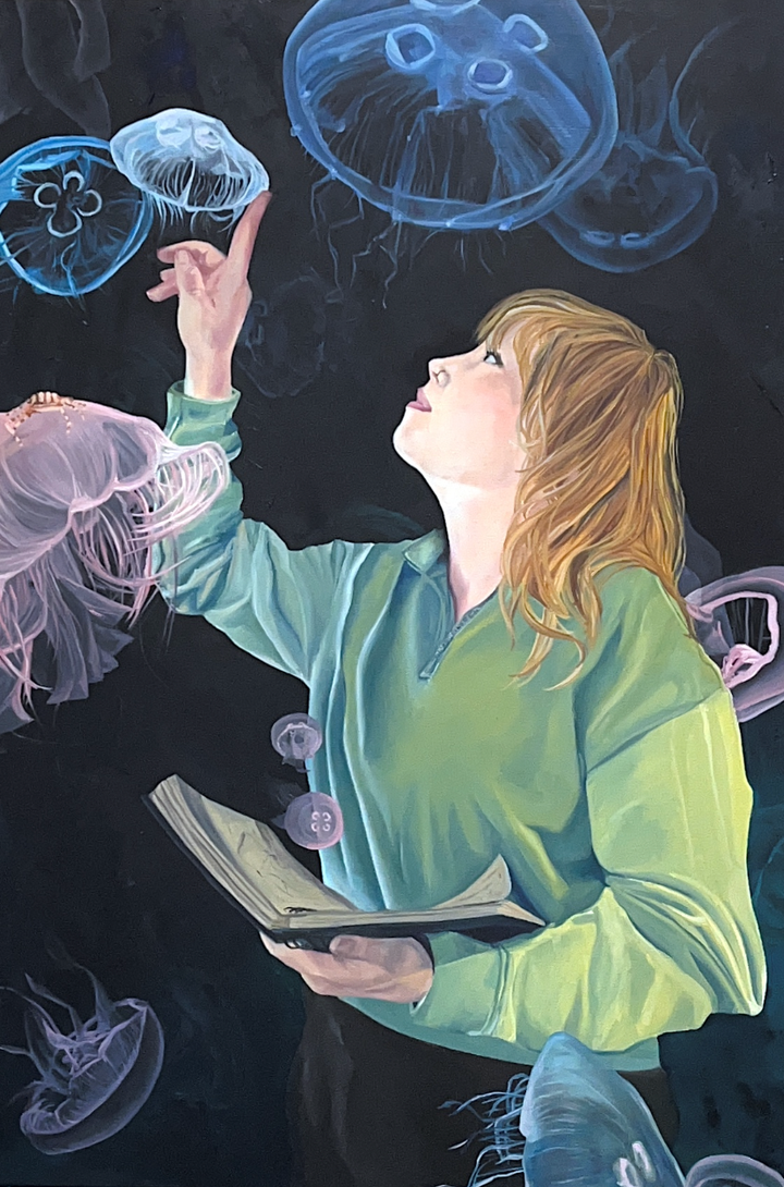FEPPS provides an accredited college program for incarcerated students and supports pathways to higher education after release. Through my work with FEPPS, I have witnessed firsthand the power of imagination in environments designed to suppress it. My current series, For Us, reflects these experiences by depicting solitary figures surrounded by elements of their imagination. Each painting features a single figure, drawn from real models who are stalking survivors, each with a unique story of survival and resilience. These paintings challenge traditional portraiture by centering not the physical body, but the unseen forces that define a person’s reality: thought processes, stories, and imagination.